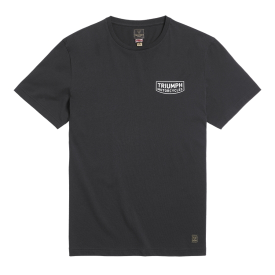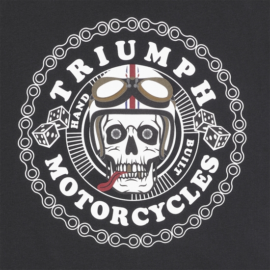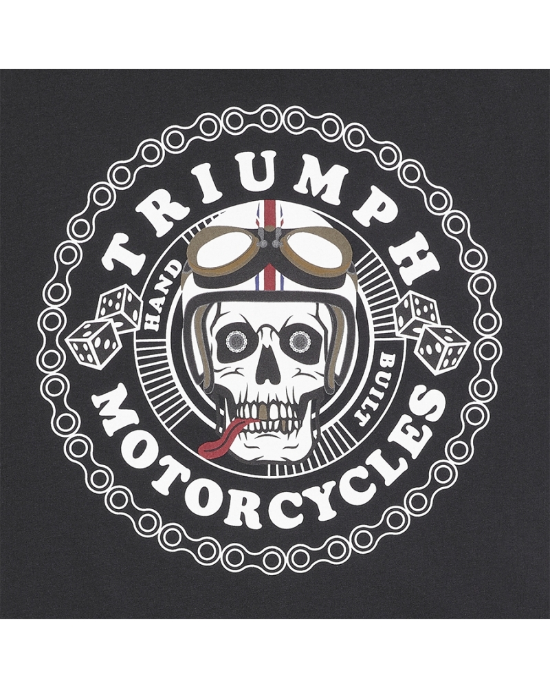 T-shirt doux 100 % coton noir, avec imprimé Triumph Motorcycles en forme sur la poitrine gauche, écusson tissé emblématique sur la hanche gauche et motif imprimé crâne de motard doux au toucher à l'arrière.