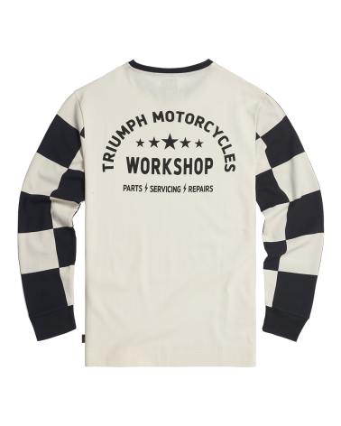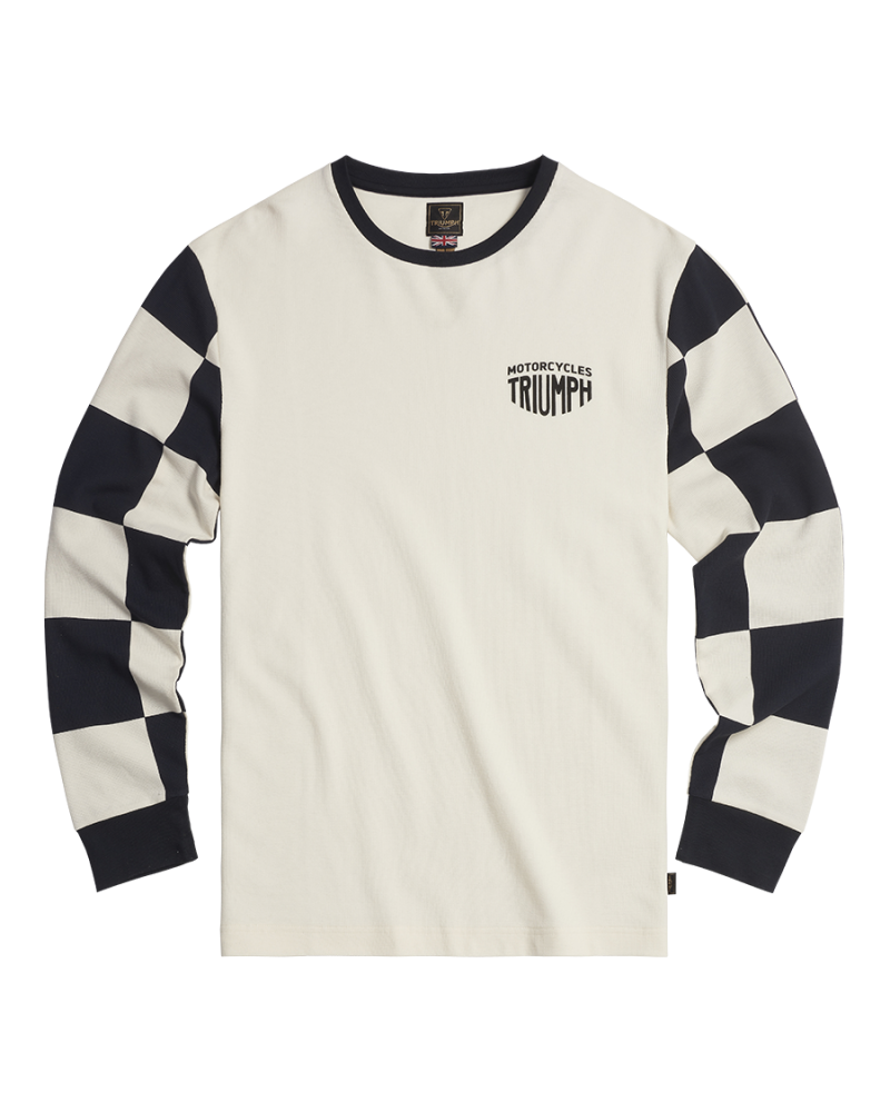 Un t-shirt à manches longues et col rond 100 % coton nid d’abeille. Se démarquant par des manches longues à damiers, un imprimé Triumph Motorcycles stylisé sur la poitrine gauche et l’imprimé en arc de cercle Triumph Workshop au toucher doux dans le dos.