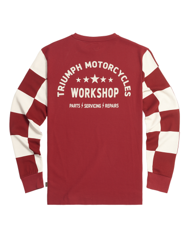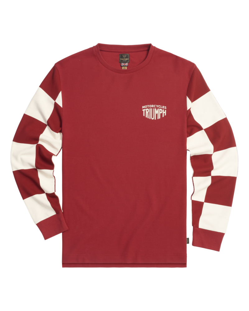 Un t-shirt à manches longues et col rond 100 % coton nid d’abeille. Se démarquant par des manches longues à damiers, un imprimé Triumph Motorcycles stylisé sur la poitrine gauche et l’imprimé en arc de cercle Triumph Workshop au toucher doux dans le dos.